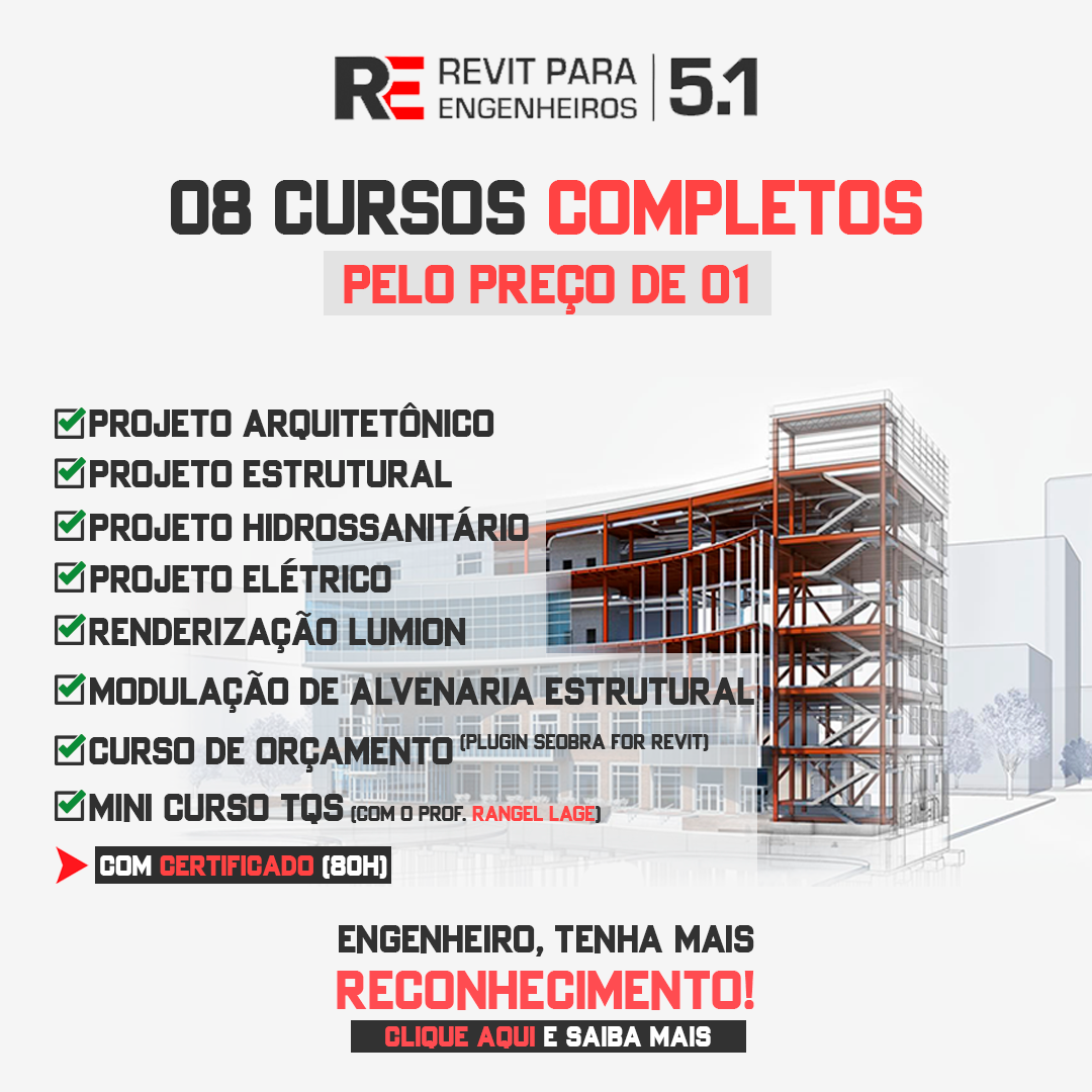 Seja um expert em Revit. 8 cursos em um, projeto arquitetôncio, projeto estrutural, projeto de instalações e muito mais. Dê um plus em seus projetos melhorando sensivelmente a qualidade de entrega de seus trabalhos! |  |