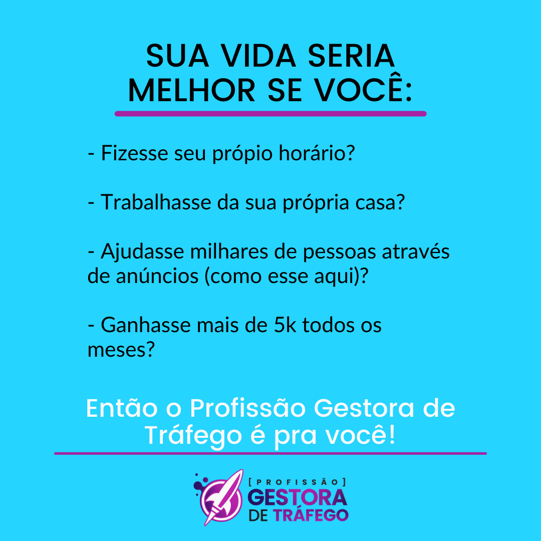 O Segredo Para Ter a Melhor Profissão do Digital. Existe apenas 1 segredo para conseguir a melhor profissão do digital, e eu te conto tudo dentro do meu Treinamento Profissão Gestora de Tráfego. Aprenda a ganhar dinheiro gerando anúncios para vender produtos digitais ou físicos pela internet sem precisar ter estoque ou comprar nada! |