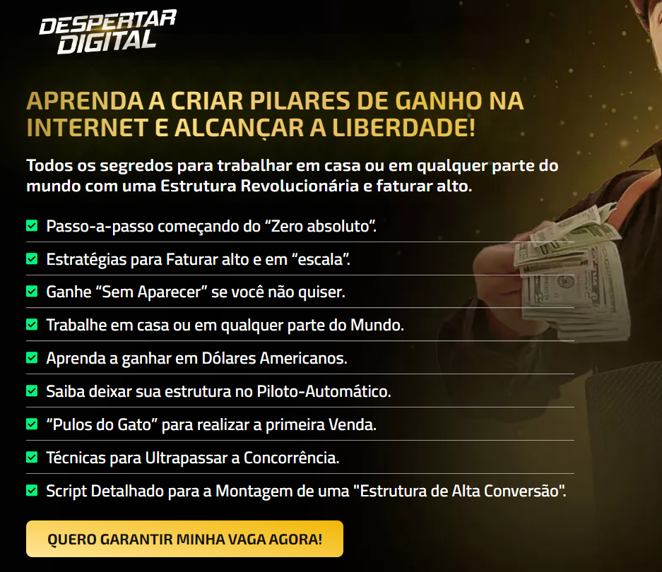 O curso DESPERTAR DIGITAL é formado por um total de 22 módulos com mais de 300 vídeo-aulas ricas em informações que farão com que qualquer pessoa, começando do “zero absoluto” possa aprender a ganhar dinheiro estando em qualquer parte do mundo usando uma conexão com a internet. | Fórmula Negócio Online